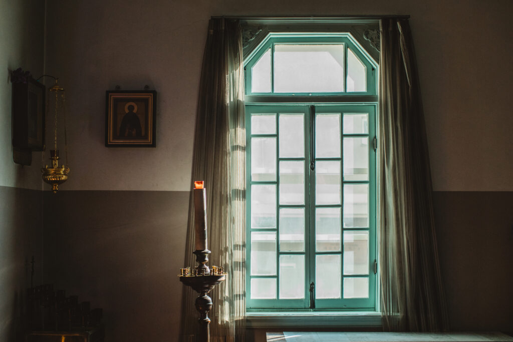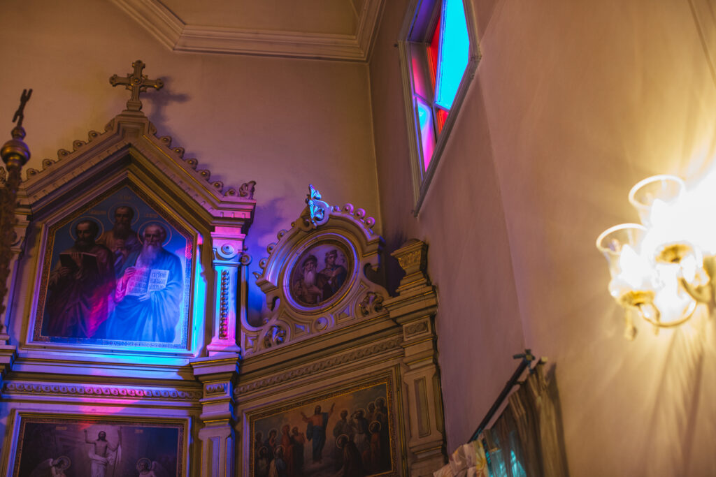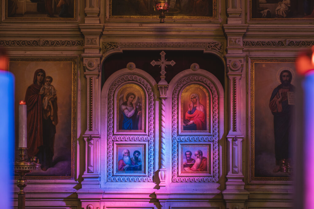 イコノスタスの向こうに広がる至聖所は、聖職者のみが入ることを許された場所。イコノスタス上部に少しだけあいた隙間から、その奥に広がる神聖な空間を感じてみてください。