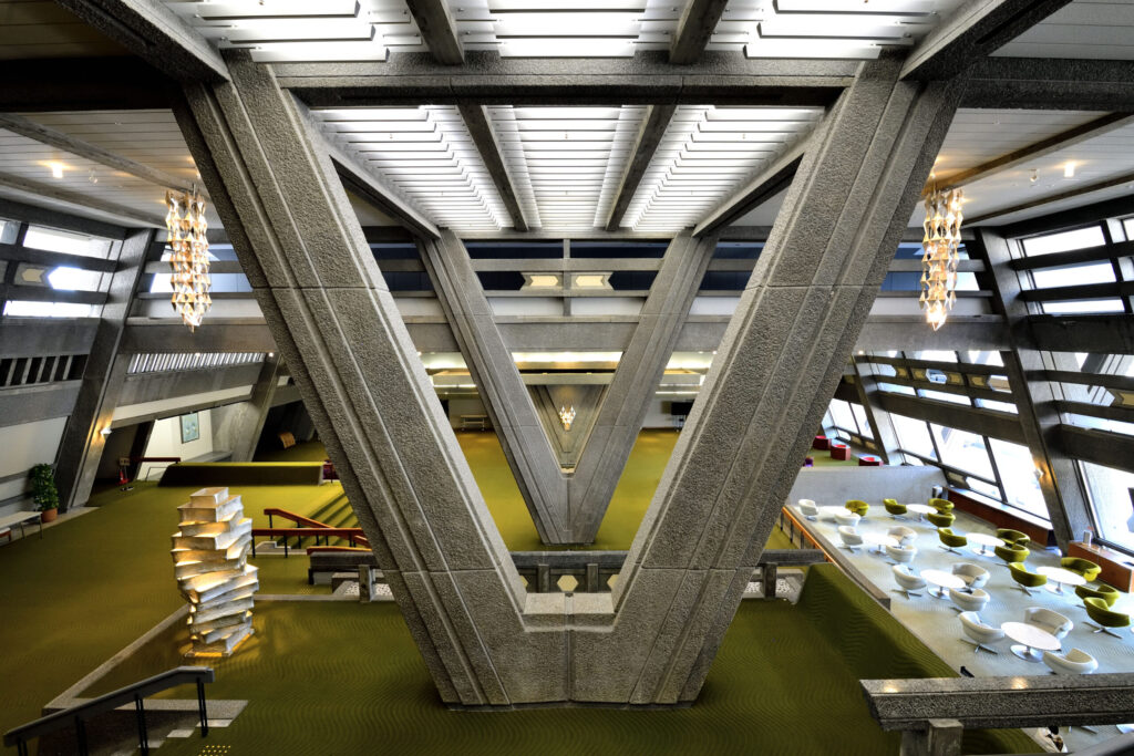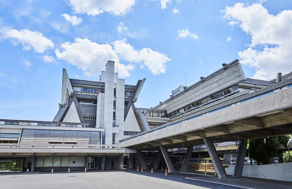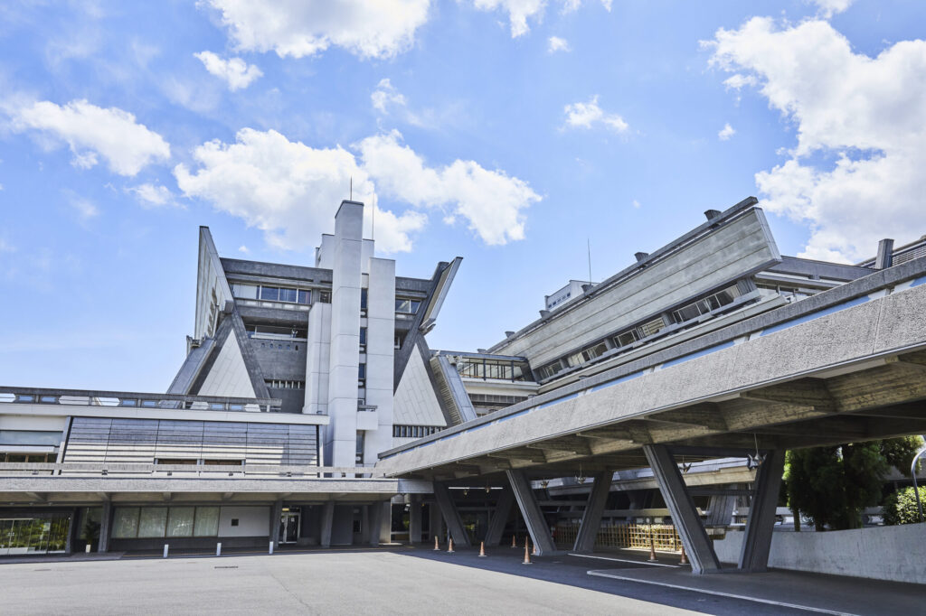日本初の国際会議場にして、巨匠・大谷幸夫の代表作。台形と逆台形を組み合わせた、まるで宇宙船のような空前絶後の傑作建築。宝ヶ池の絶景を望む広大な敷地を持ち、戦後モダニズムの金字塔として知られる。